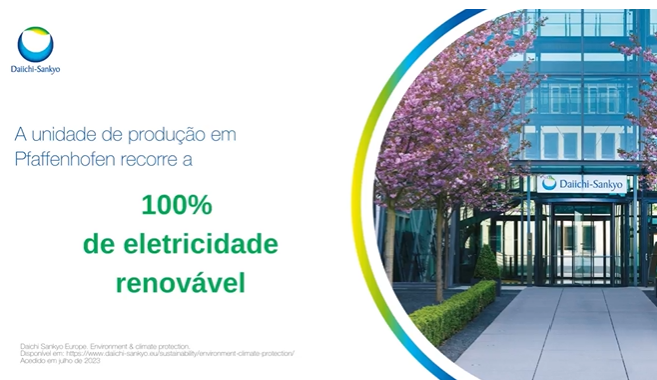 Na Daiichi Sankyo Europa, destacamos nossa fábrica em Pfaffenhofen, Alemanha, que usa 100% eletricidade renovável e biomassa local para sustentabilidade.